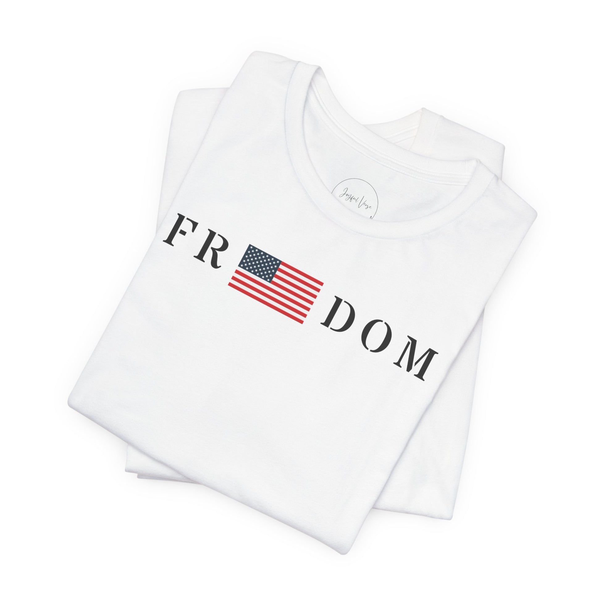 This stylish Unisex Jersey Short Sleeve Tee is perfect for those who love to express their individuality while staying comfortable. Made from 100% Airlume combed and ring-spun cotton, this tee offers a lightweight and breathable fit, ideal for everyday wear. With its classic crew neckline and retail fit, it effortlessly transitions from casual outings to semi-formal events. The bold design featuring the word "FREEDOM" with an American flag adds a touch of patriotism, making it perfect for holidays like Independence Day, Memorial Day, or any occasion where you want to show off your love for your country. This tee is perfect for anyone who values comfort, style, and a sense of freedom. Wear it to BBQs, family gatherings, or a day out with friends!