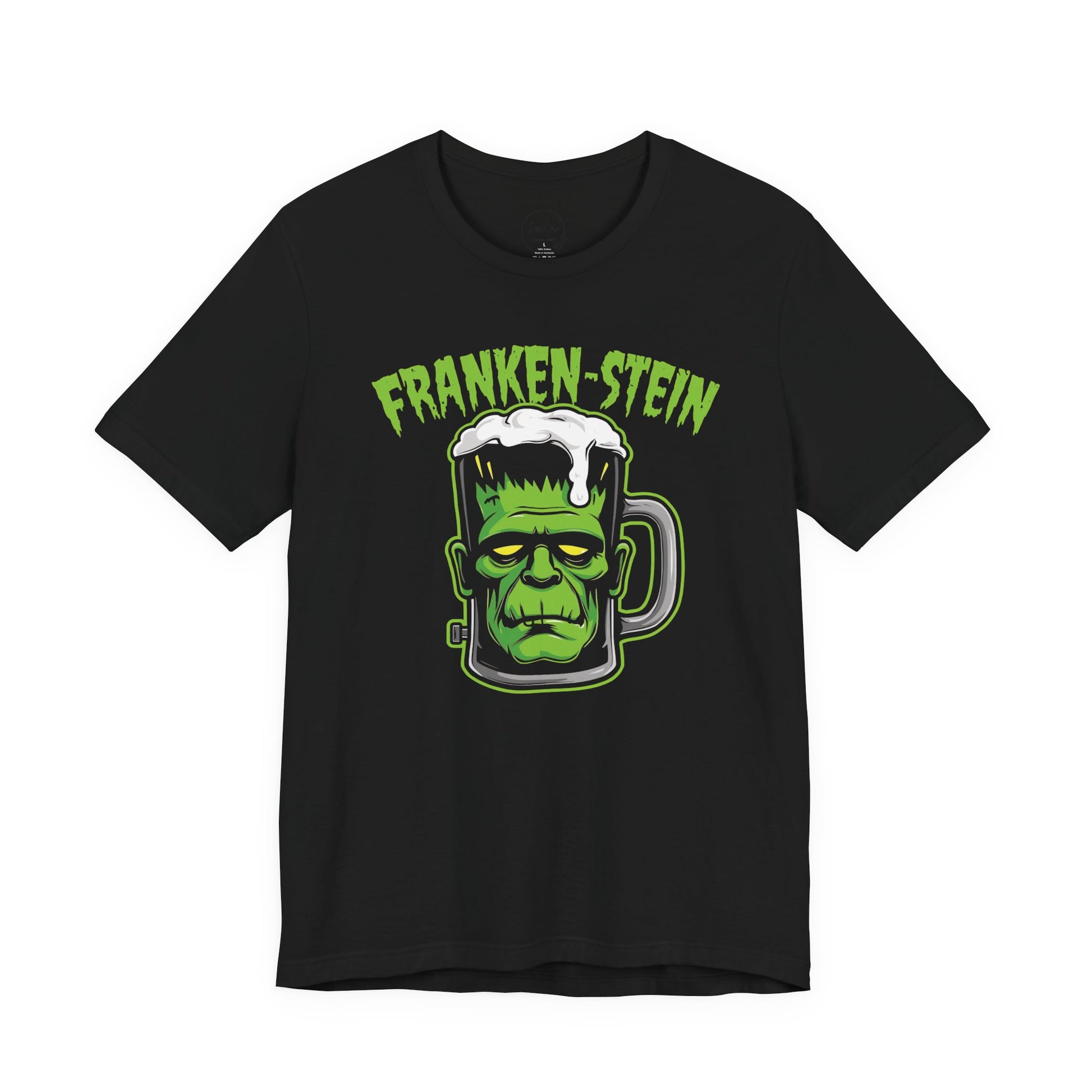 A Halloween-themed T-shirt featuring a cartoon-style Frankenstein monster face shaped like a beer mug. The neon green and gray outline pops against the black background, with distressed spooky text at the top saying “FRANKEN-STEIN”. Perfect for those looking to add a touch of spooky fun to their wardrobe for Halloween celebrations and horror enthusiasts.